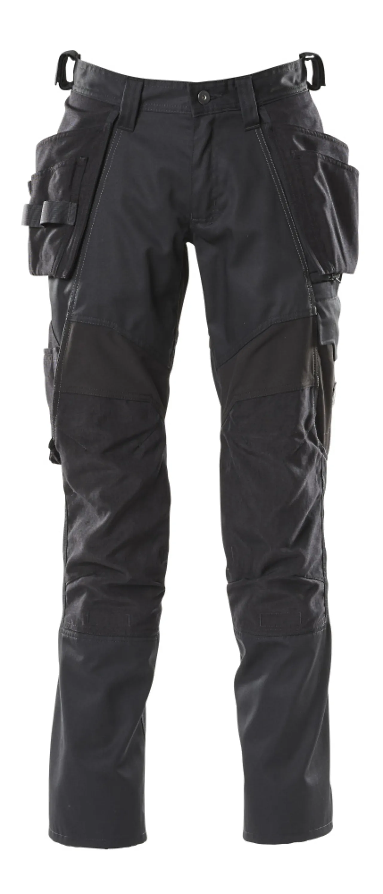 Deler av produktet er laget i stretchstoff. Kombinasjon av lett stoff i kvalitet 442 og fireveis stretch i kvalitet 511. Lommene er integrert i designen. Tonålssømmer på ben og i skritt. Bukseben er ergonomisk formet. Lavt liv. Beltestropper. Gylf med glidelås. Hengelommer i CORDURA. Forlommer. Baklommer. Lårlomme med telefonlomme og klaff med skjult trykknapp og integrert ID-kortholder. ID-kortholderen kan tas av. Tommestokklomme i CORDURA med ekstra lommer. Knelommer i slitesterk CORDURA (500 D). Enkel individuell tilpasning en knepute høyde. Vi anbefaler kneputene MASCOT Waterloo til denne modellen. Med trykk og reflekser.