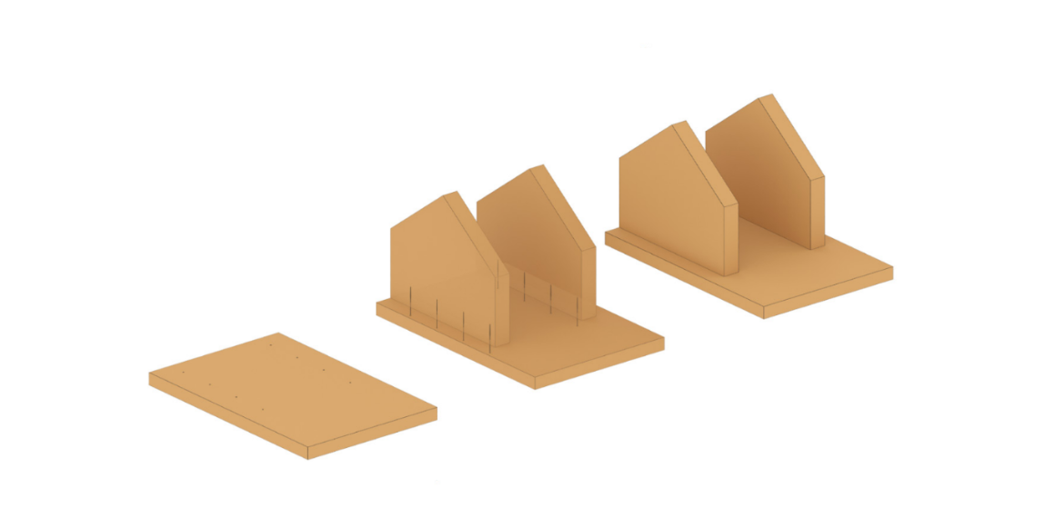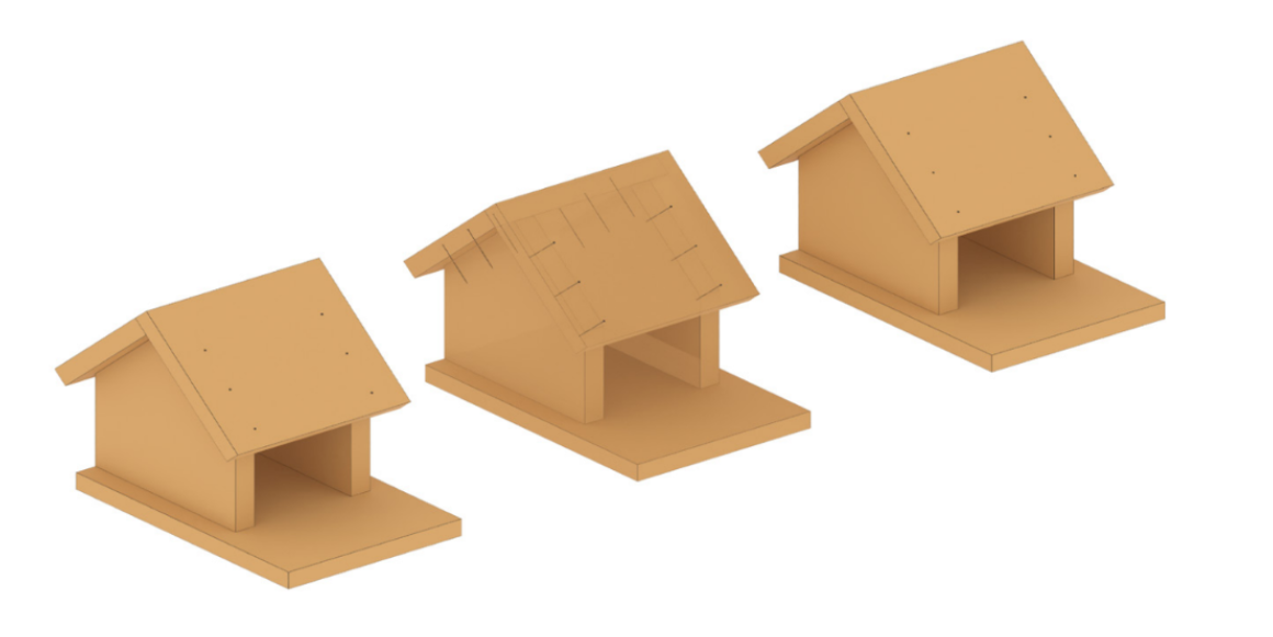 Plasser takdelene slik at de overlapper hverandre, med den lengre delen over den kortere. Forborr og skru inn 3 skruer på hver side av hver takdel. Trelim kan benyttes mellom takdelene for ekstra tetthet og holdbarhet.