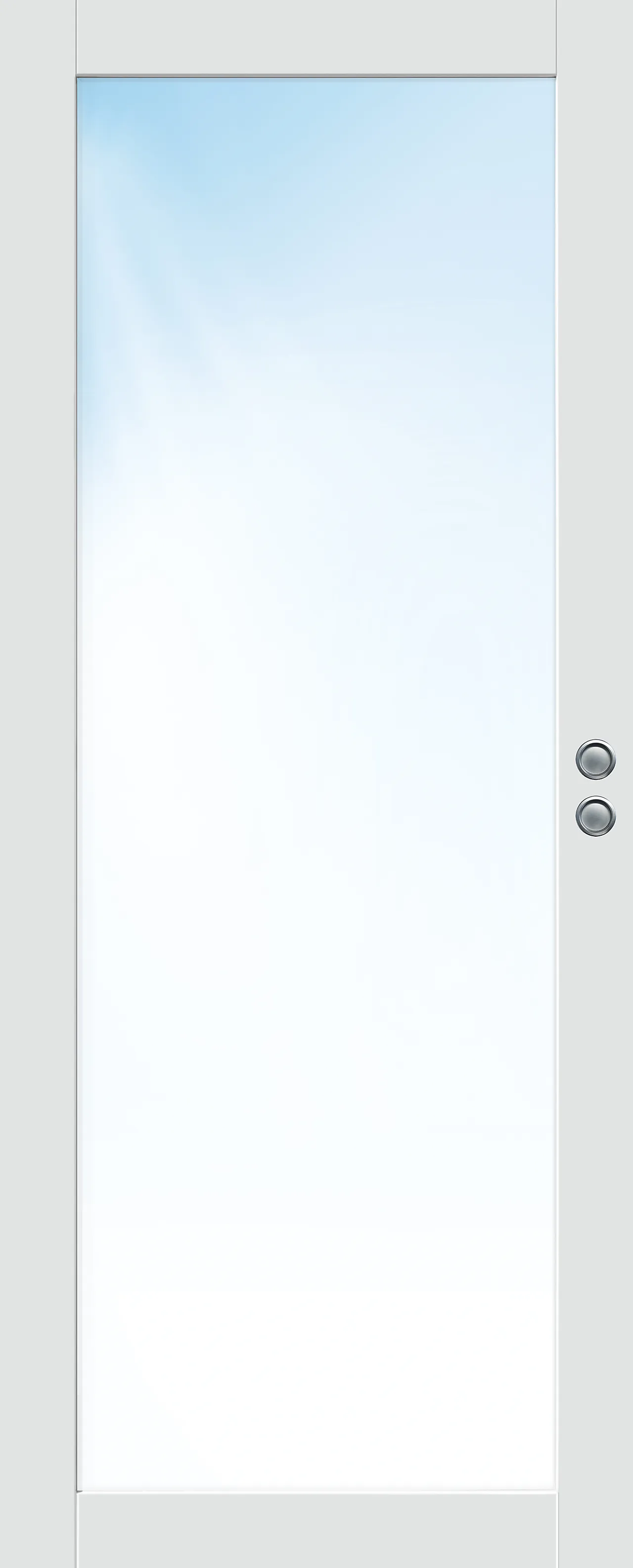 Bygg1 Skyvedør Base 1 med glass hvit Massiv innerdør i moderne og stilreint design med ett glass. Stabil dør med god tyngde og overflatebehandling. Det beste valget viss du ønsker skikkelige tredører med god kvalitet, uten at de skal koste for mye. 40 mm dørblad, ramtre av laminert furu (10cm), speil av 10mm MDF, 4mm HDF på alle treflater og kanter. Blank låskasse 2014 og hvite snap-in beslag. Hvitmalt NCS S 0502-Y er standard, andre farger på bestilling.