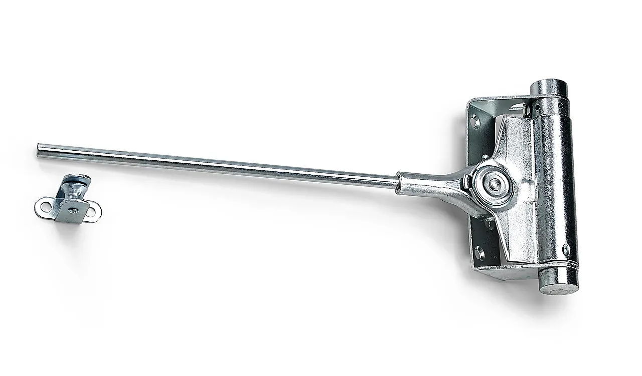 Dørlukker av stål med fjærbelastning. Maks dørvekt 40 kg. Lengde 235 mm. Høyde sylinder 100 mm.
