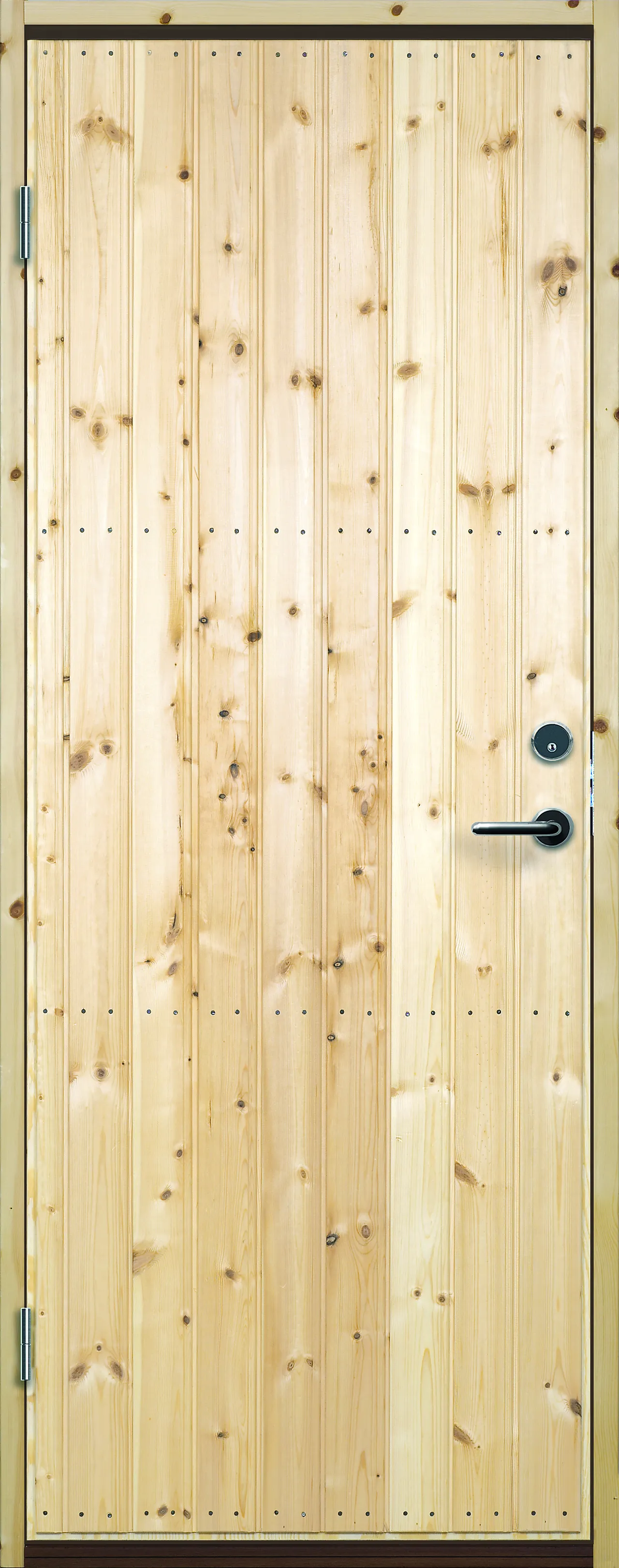 Bygg1 boddør Lom natur er en solid boddør med ubehandlet stående furupanel på utsiden og oppbygning med 35 mm isolasjon og kryssfinér med aluminium fuktsperre på begge sider som gir god stabilitet og isoleringsevne. Leveres med montert furukarm med pakning og terskel i bøk som gir tett lukking og god slitestyrke i daglig bruk. Døren leveres med låskasse, sylinder og justerbare løftehengsler for enkel montering og tilpasning. Overflaten må behandles før montering for å sikre holdbarhet og ønsket finish.