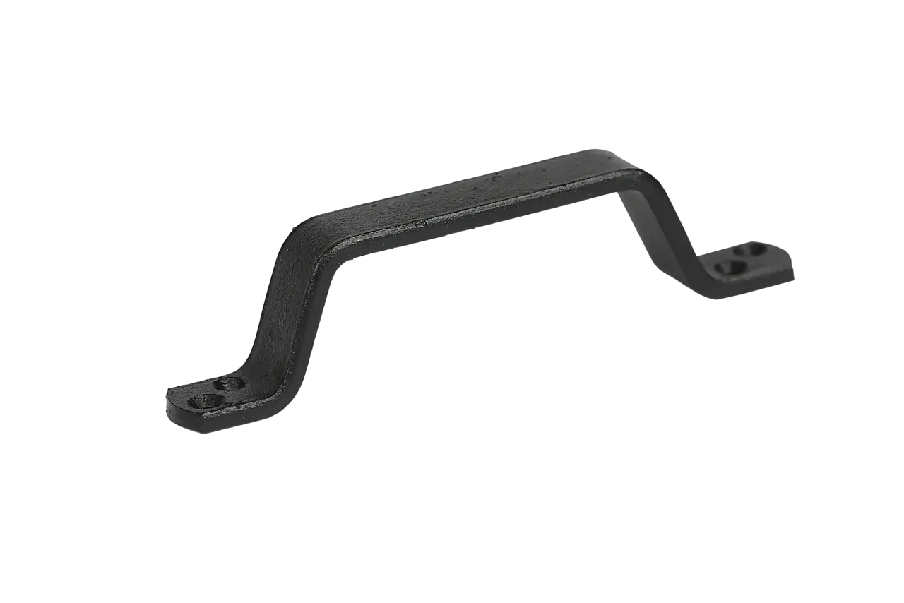 Stilrent dørhåndtak med finstruktur i varmforsinket utførelse, pulverlakkert sort. Monteres med 4 stk skrue/bolt.