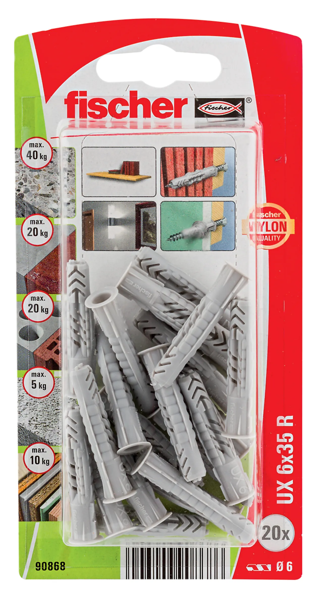 En utmerket plugg som er effektiv både i massive byggematerialer og i platevegger. Bruksområdene er nesten grenseløse.Til festing av alle gjenstander som kan festes med tre eller sponplateskruer til murverk og alle hulromvegger. Pluggen passer utmerket til både proffer og ”gjør det selv” brukeren. R = med Krage / L = Lang versjon