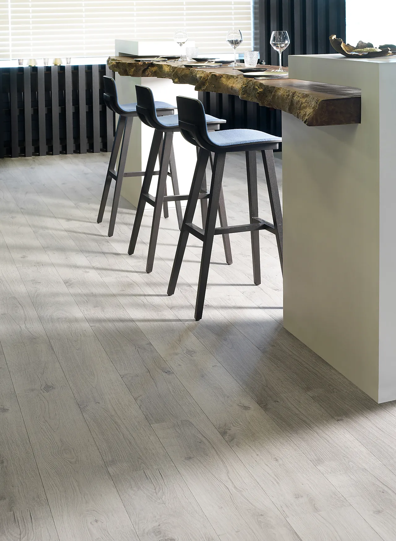 Laminatgulv med et unikt låsesystem som kobler gulvbordene enkelt sammen, uten bruk av lim. Rolig og naturlig design uten fuger eller kvister, med en myk grå/bruntone. Overflaten er matt og komfortabel, og gir deg den samme følelsen som oljet parkett. Designet formidler den naturlige og enkle skjønnheten ved treet. Klikklåssystemet i aluminium gjør monteringen rask og enkel. 1-stavs-plankene kommer med Silent System som er et lyddempende underlag. Plankene har en impregnert, vannresistent HDF-kjerne som reduserer fuktgjennomtrengning. Gulvet innehar den høyeste klassifiseringen (klasse 34), hvilket gjør at det passer til alle offentlige og private rom, med unntak av våtrom. Laminatgulvet er slitesterkt og krever minimalt med vedlikehold. En pakke inneholder 8 bord og 1,9119 m2. Tykkelse 11 mm. Produktet kan leveres Ferdig Montert, som du kan lese mer om her