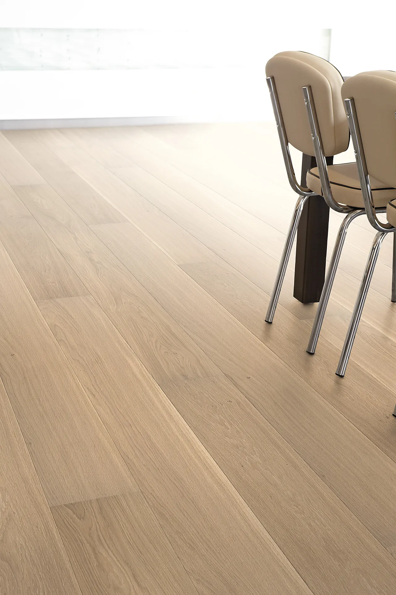 1-stavs eikeparkett med 13 mm tykkelse. Gulvet har et rolig uttrykk med noe fargespill og kvist. Overflaten er hvitpigmentert og mattlakkert. Det lyse gulvet gir et jordnært og nordisk uttrykk. Hver plank har en bredde på 181 mm, dette øker romfølelsen og fasen på langsidene fremhever følelsen av ekte plank. Et parkettgulv med varmt utseende og god slitestyrke. Rask og sikker legging med 5G Click system. Velegnet for gulvvarme og nordisk klima. Produktet kan leveres Ferdig Montert, som du kan lese mer om her