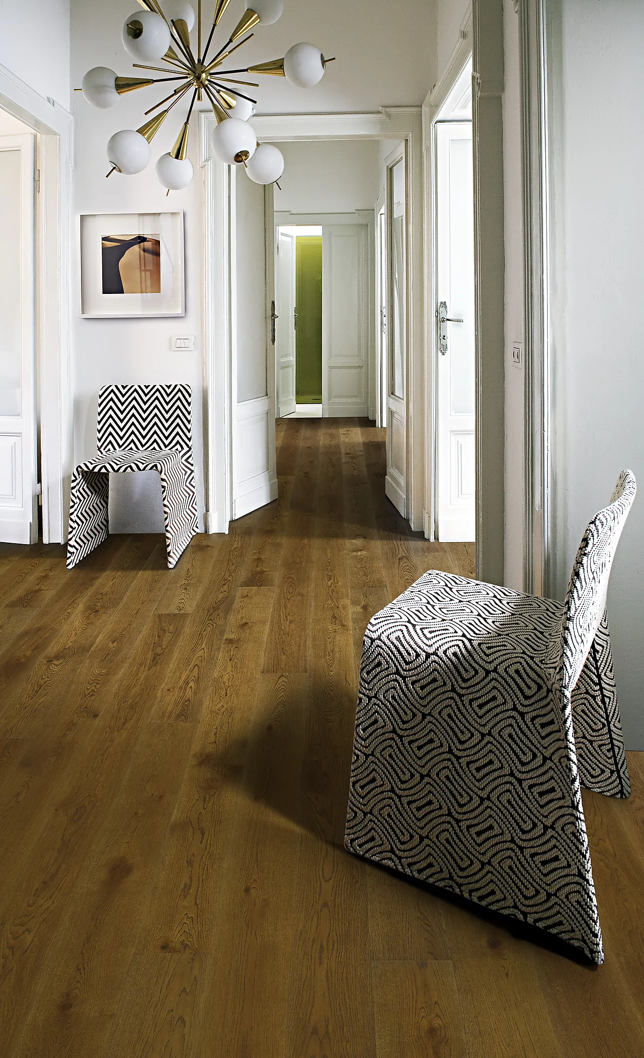 Parkett eik Nouveau er en serie av gulv med børstet, faset og pigmentert overflate. De ulike modellene kommer med matt lakkert overflate. Basisen på planken er eik i naturlig fargevariasjon med noe kvist og utbedret kvist. Woodloc5S klikk gjør gulvet enkelt å legge, kan legges i store areal opp til 25 meter i bredden. Monteres med lim på plant, fast undergulv eller legges flytende, kan kombineres med gulvvarme. Produktet kan leveres Ferdig Montert, som du kan lese mer om her