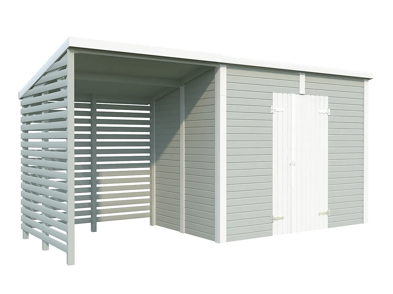 En praktisk bod med tilbygg til oppbevaring av hageredskaper, plenklipper, hageputer m.m. Boden er produsert i prefabrikkerte veggelementer, og er enkel å montere. Doble dører i front gjør det enkelt å få inn større ting som hagemaskiner og hagemøbler. Praktisk sidebygg for lagring av f.eks. ved, sykler osv. Boden leveres som byggesett inkludert gulv og alt av festemidler. Valgfritt taktekke kjøpes separat. Boden leveres ubehandlet, og vi anbefaler å overflatebehandle den i ønskede farger umiddelbart etter montering for å beskytte treverket mot fukt, sopp m.m. Husk å male døra på begge sider.