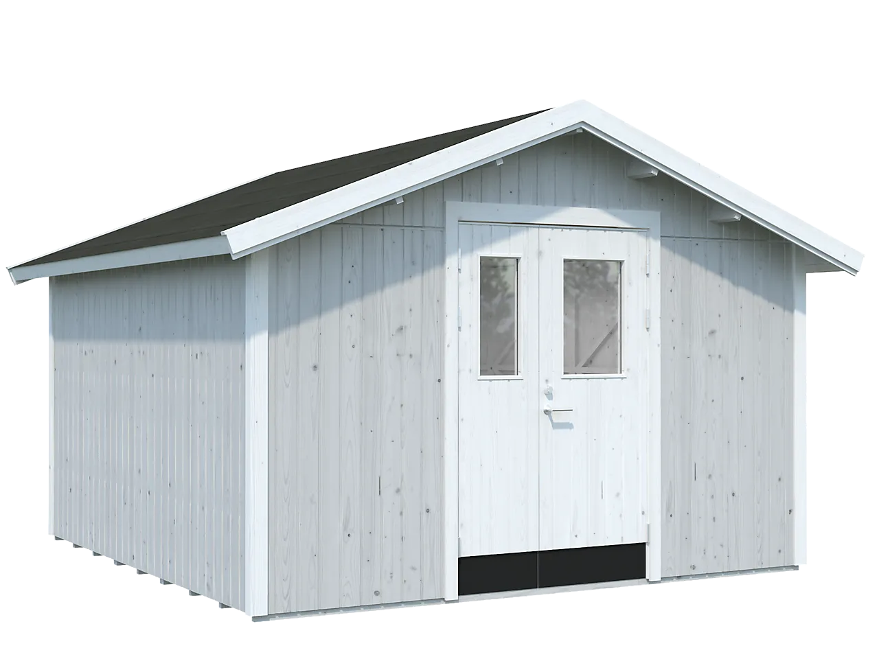 En tidløs bod til oppbevaring av hageredskaper, plenklipper, hageputer m.m. Boden kommer med isolerte dører med sylinderlås, og vinduer i dørene gir mer veggplass i boden. Doble dører gjør det enkelt å få inn større ting som hagemaskiner og hagemøbler. Boden er produsert i prefabrikkerte veggelementer, og er enkel å montere. Den leveres som byggesett inkludert gulv og alt av festemidler. Valgfritt taktekke (f.eks. shingel) kjøpes separat. Boden leveres ubehandlet, og vi anbefaler å overflatebehandle den i ønskede farger umiddelbart etter montering for å beskytte treverket mot fukt, sopp m.m. Husk å male døra på begge sider.