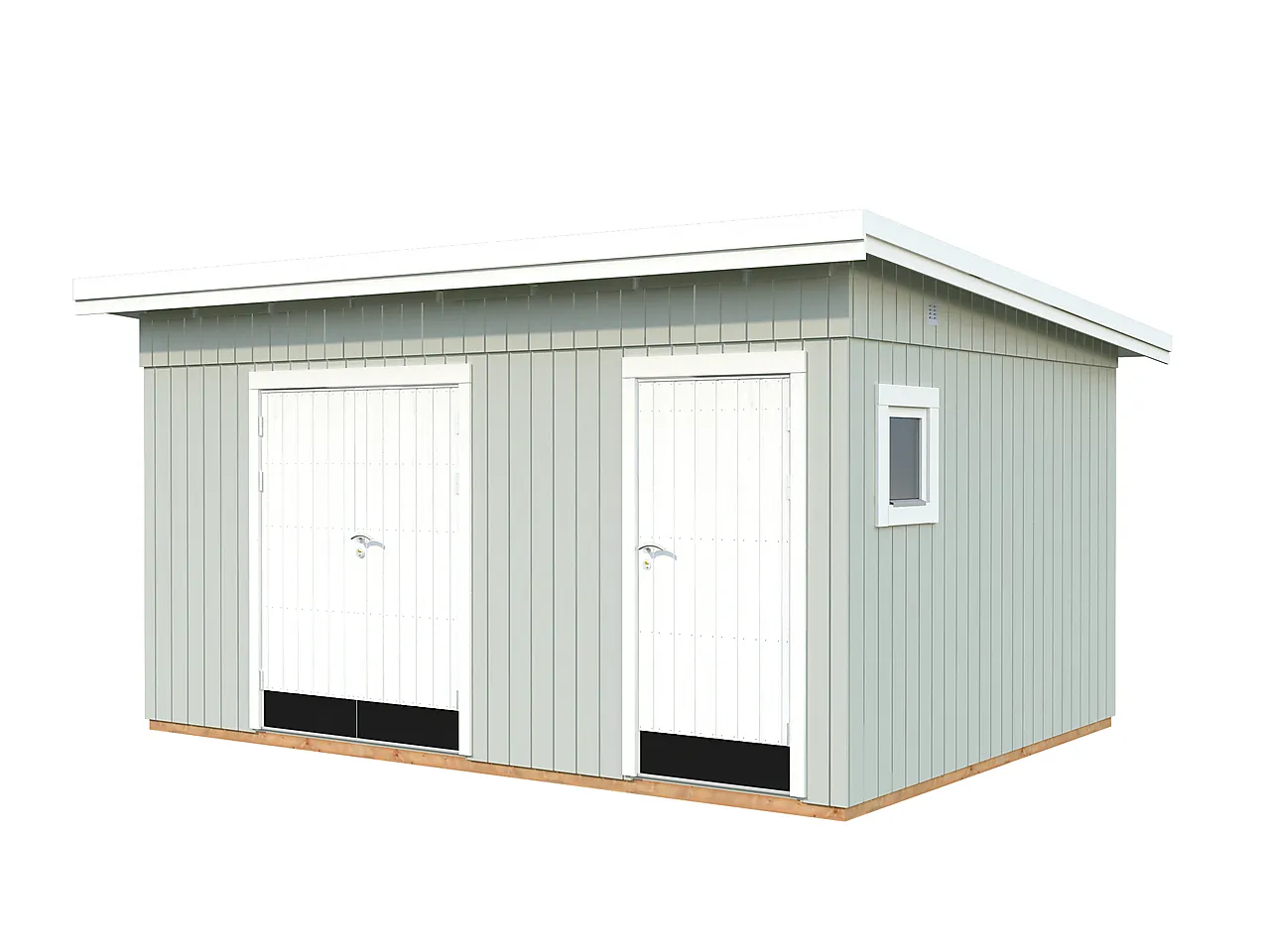 Stor, solid og praktisk redskapsbod med 2 rom. Den har et moderne og stilrent design med skråtak, og er utstyrt med doble dører i fronten av det største rommet for enkel tilgang til større gjenstander som hagemaskiner, hagemøbler, sykler og mer. Det mindre rommet har sin egen dør, perfekt for oppbevaring av mindre redskaper og ved. Redskapsboden er laget av prefabrikkerte veggelementer som 36x70 mm spikerslag, vindsperre og 18 mm uhøvlet kledning. Den har en isolert dør med sylinderlås og leveres som et komplett byggesett inkludert gulv og alt nødvendig festemateriale. Taktekke er valgfritt og kan kjøpes separat. Redskapsboden leveres ubehandlet, og det anbefales å overflatebehandle den med ønskede farger umiddelbart etter montering for å beskytte treverket mot fukt, sopp og lignende. Husk å male begge sider av dørene for ekstra beskyttelse.