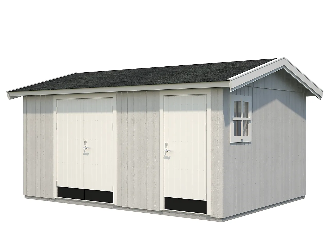 En romslig, solid og praktisk redskapsbod med to separate rom. Dobbeltdører i fronten av det største rommet gjør det enkelt å få plass til større gjenstander som hagemaskiner, hagemøbler og sykler. Det mindre rommet har en egen dør og er perfekt for oppbevaring av mindre redskaper og ved. Boden er enkel å montere takket være de prefabrikkerte veggelementene som består av 36x70 mm spikerslag, vindsperre og 18 mm uhøvlet kledning. Døren er isolert og utstyrt med en sylinderlås for ekstra sikkerhet. Boden leveres som et komplett byggesett inkludert gulv og alle nødvendige festemidler. Taktekke (for eksempel shingel) kan kjøpes separat etter behov. Boden leveres ubehandlet, og det anbefales å behandle den med ønskede farger umiddelbart etter montering for å beskytte mot fuktighet og sopp. Husk å male begge sider av dørene for optimal beskyttelse.