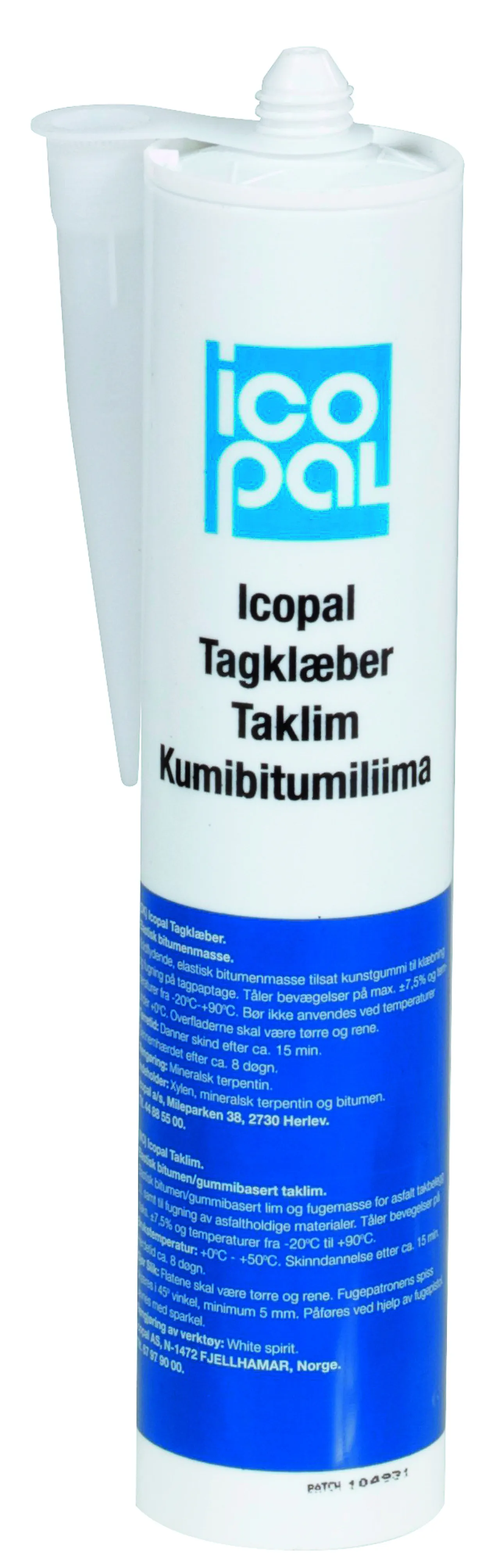 Icopal taklim er en elastisk bitumen/gummibasert lim og fugemasse. Den fester godt til de fleste underlag og har kort tørketid. Limet er ideelt til bruk på tverrskjøter på Icopal Topaafe, shingel og takmembraner. Også velegnet til klebing av sandbestrødde omlegg ved enkelttekkinger med asfalt takbelegg på tretak, til detaljer ved takshingel, inntekkinger av piper og gjennomføringer, samt mindre reperasjonsarbeid. Forbruk: ca 0,5 liter per rull ved klebing av omlegg/ca 1 liter per m2.