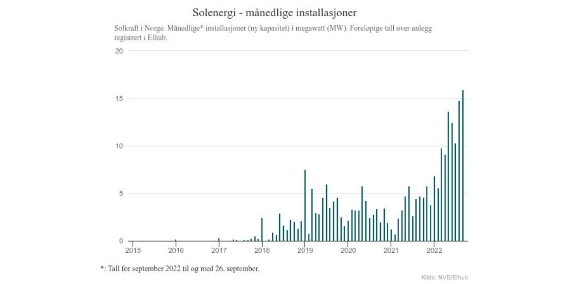 Flere og flere velger nå solceller på taket også i Norge, som illustrert i grafen under.