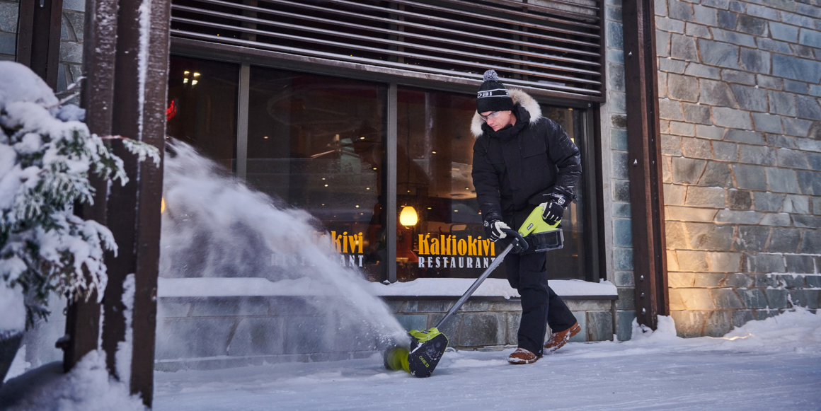 Til mindre gårdsplasser, terrasser og trapper anbefaler vi Ryobis kompakte, lette, elektriske snøfreser. Den er lett i bruk og passer for alle, og på størrelse med en spade, så den er enkel å oppbevare.