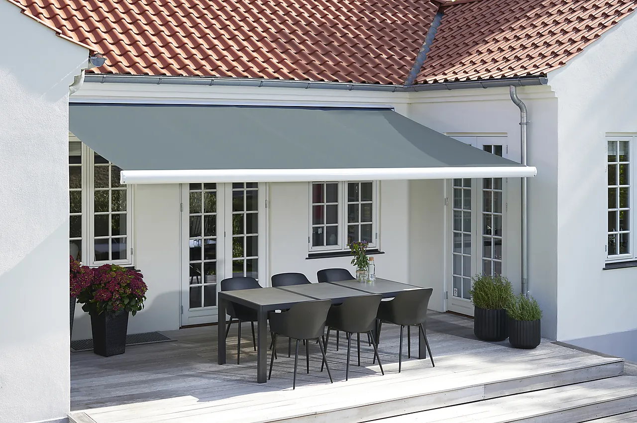 Flott terrassemarkise som passer alle typer hus. En enkel og grei måte å regulere sollysetLeveres med helkassett og motor med fjernkontroll. Når markisen trekkes inn skjules den i en helkassett som gir et fint og ryddig uttrykk. Kassetten beskytter også duken mot vær, vind og regn samt UV-stråling når markisen ikke er i bruk. Armenes fallvinkel kan reguleres etter hvor høy eller lav sol.Kraftig hvit epoxybelagt aluminiumsramme med grå duk. Leveres med universalbrakett for montering vegg. Enkel montering. Utfall lengde 250cm.