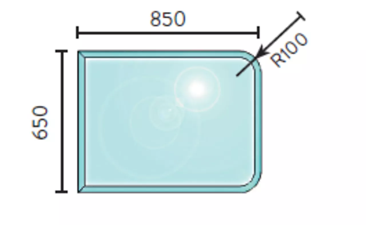 Gulvplate glass 650 x 850 mm radie på avrundede hjørner fasett